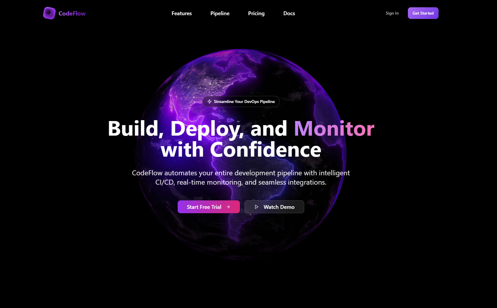 CodeFlow Modern DevOps platform that automates development pipelines with intelligent CI/CD, real-time monitoring, and seamless integrations.