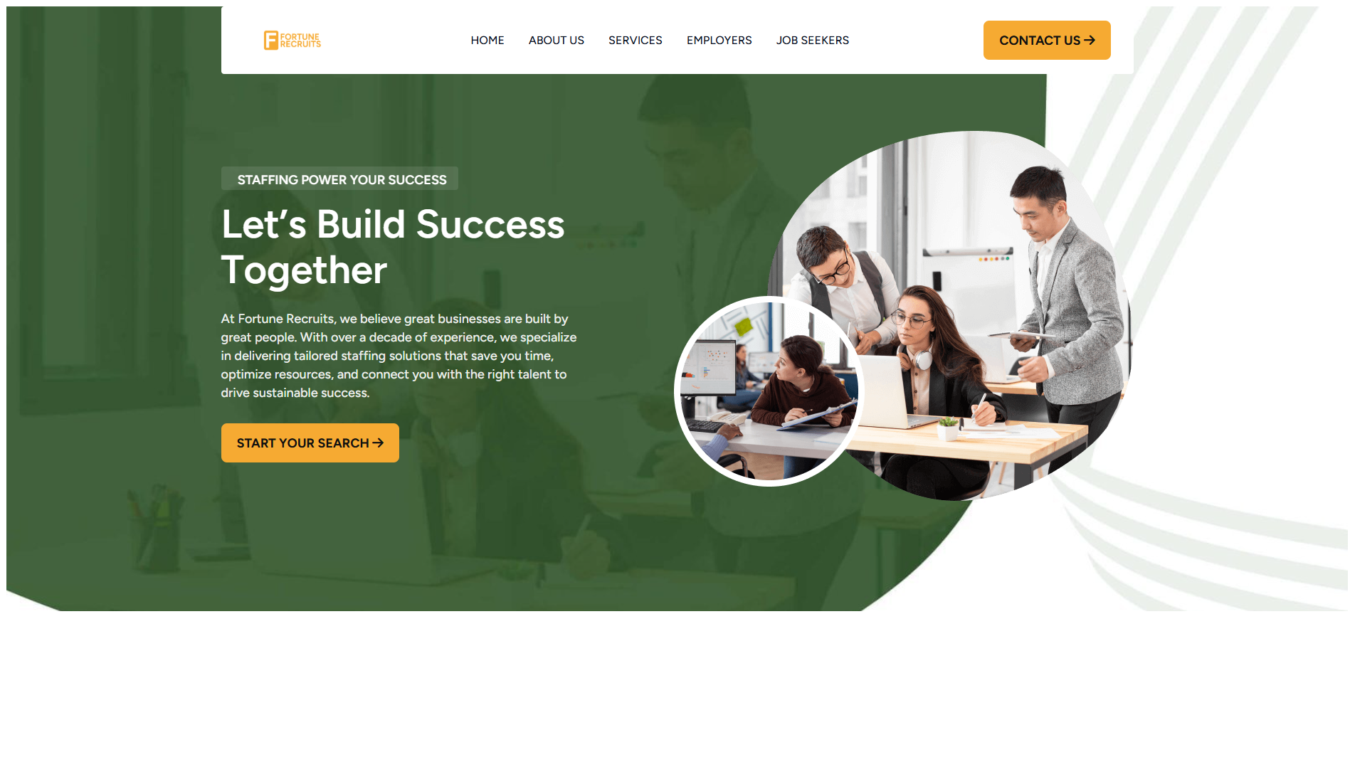 Fortune Recruits Professional staffing and recruitment website specializing in tailored staffing solutions across multiple industries including legal, technology, and manufacturing sectors.
